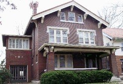 The 'American foursquares' was a simple square home constructed entirely of brick instead of shingles. These straight forward homes consisted of a two-story square frame with a very high pyramid-shaped roof. The high roof allowed a third floor. To develop the third floor space for living wide dormers with large eaves were used . On some adaptations dormers were placed on all four sides of the roof. A broad front porch extending the width of the home offered summer outdoor space.