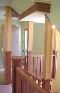 | Mahogony top and bottom railing, painted newels and spindles. Fitted railings and newels. |